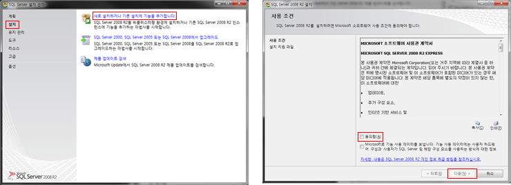 [설치센타] 좌측의 [설치]를 클릭후 우측의 [새로 설치하거나 기존 설치에 기능을 추가합니다.]를 클릭합니다.