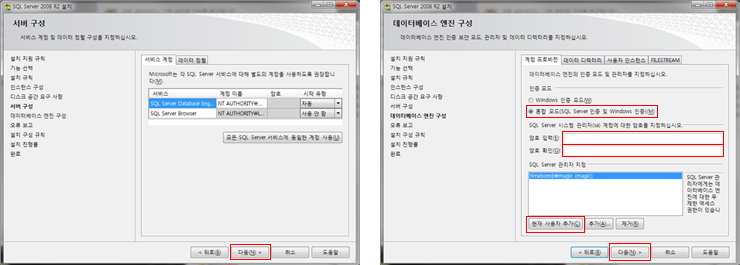 [데이터베이스 엔진 구성] SQL Server 관리자 지정 부분의 하단에 [현재 사용자 추가] 버튼을 클릭후 [다음]버튼을 클릭합니다.